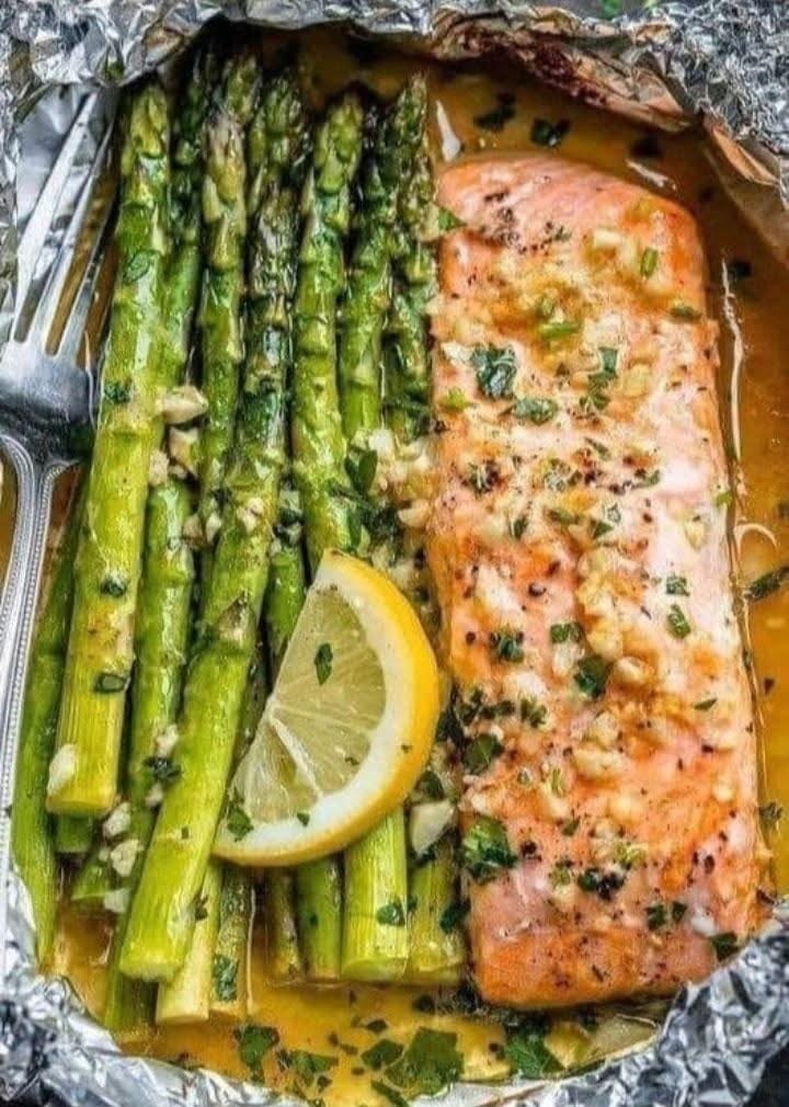 π Baked Salmon in Foil with Asparagus & Lemon Garlic Butter