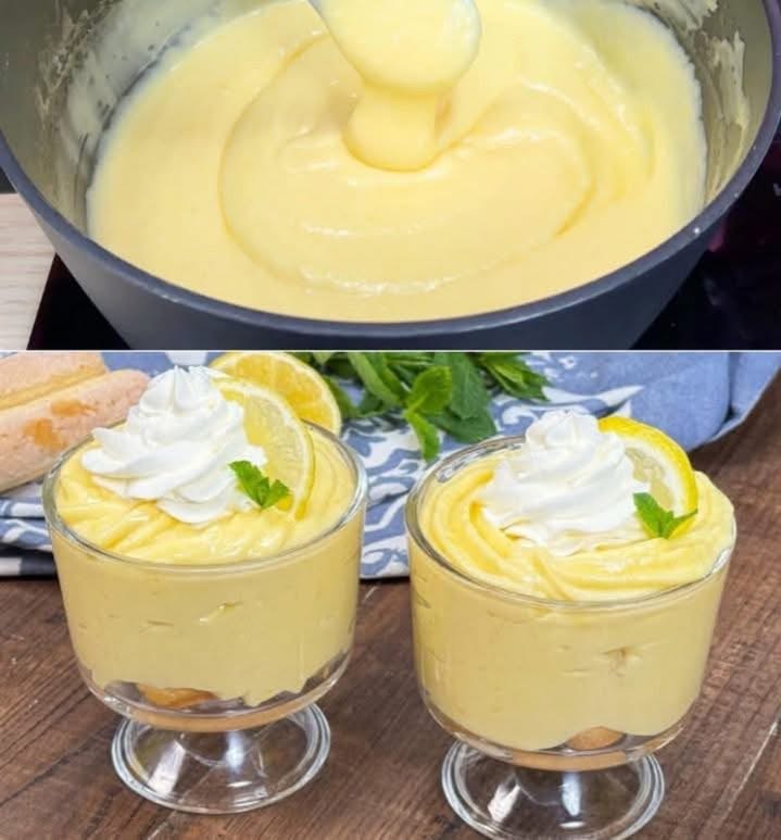 It looks like a creamy lemon dessert cups (no-bake lemon mousse / lemon cream with biscuits) πŸ‹πŸ₯„