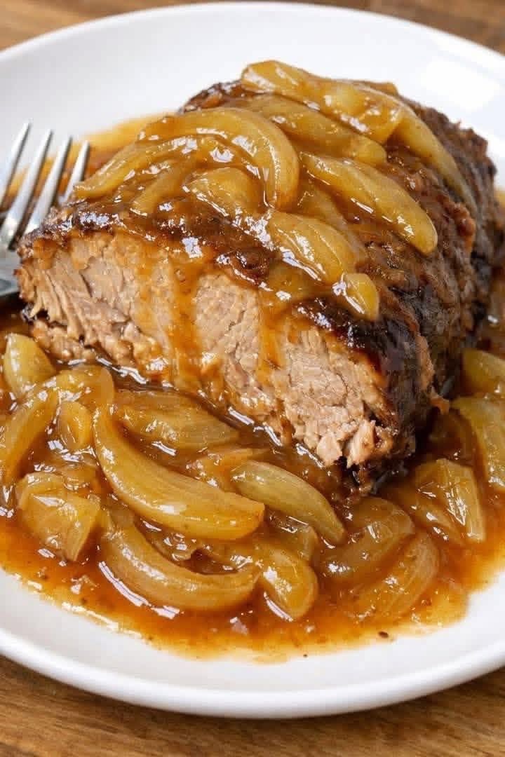 - Assemble the Slow Cooker:Place the thinly sliced large onion (sautéed or raw) at the bottom of a 6-quart or larger slow cooker.